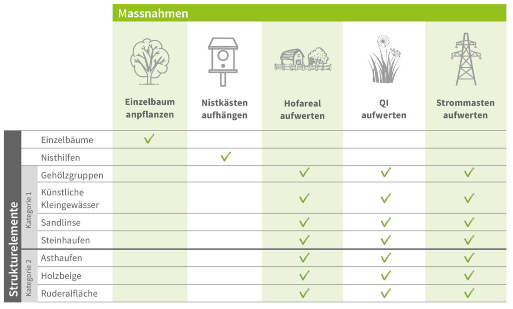 Mit fünf verschiedenen Massnahmen können interessierte Landwirte die Biodiversität fördern. Eine Massnahme besteht aus einem oder mehreren Strukturelementen. Diese Strukturelemente können Ast- oder Steinhaufen, Sandlinsen, Holzbeigen, Fertigteiche, Gehölzgruppen oder Ruderalflächen sein. Der Fokus liegt bei allen Massnahmen auf einer einfachen Umsetzbarkeit. Informationen und Anleitungen finden Sie in den einzelnen Dokumenten.